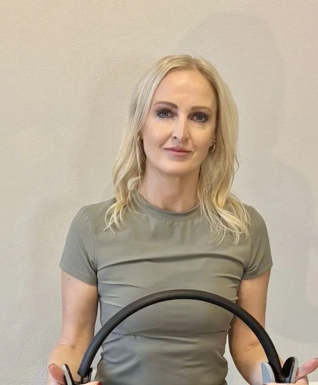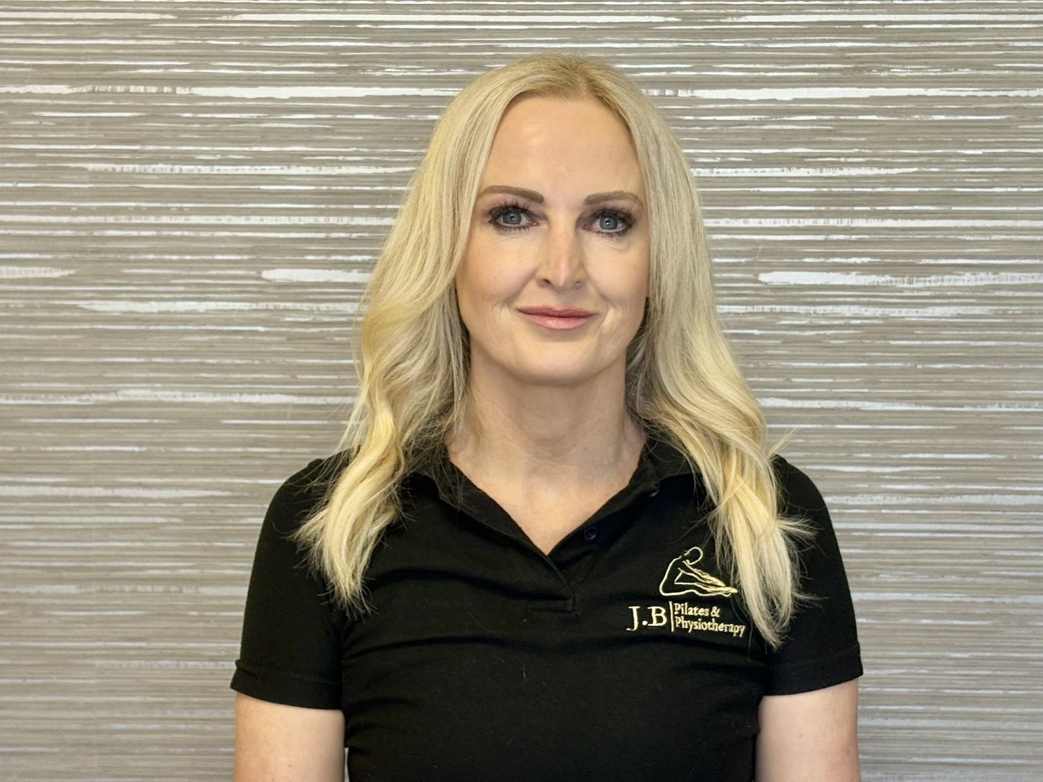 A blonde woman with wavy hair wearing a black polo shirt with a logo for J.B Pilates & Physiotherapy, standing in front of a striped wall.